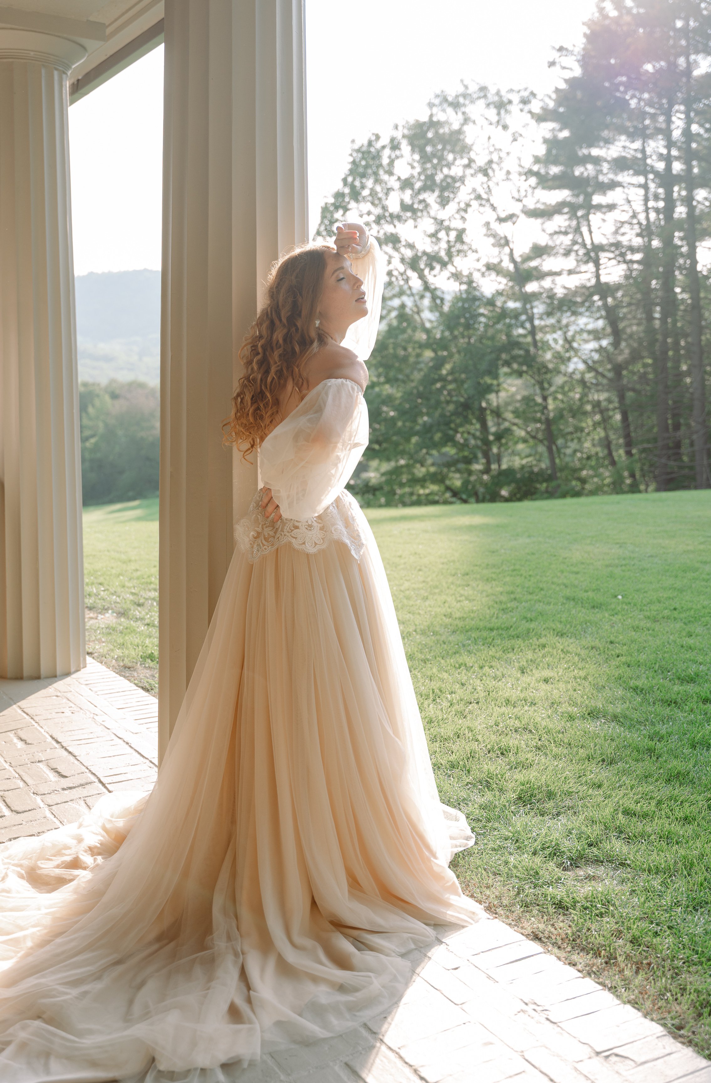 Photographed primarily at the Winbrook Estate in the Berkshires, this collection draws inspiration from the stately homes and landscapes of New England—where architecture, craftsmanship, and natural beauty exist in quiet harmony. Formal gardens, stone terraces, and historic interiors inform gowns that balance structure and softness, tradition and individuality.