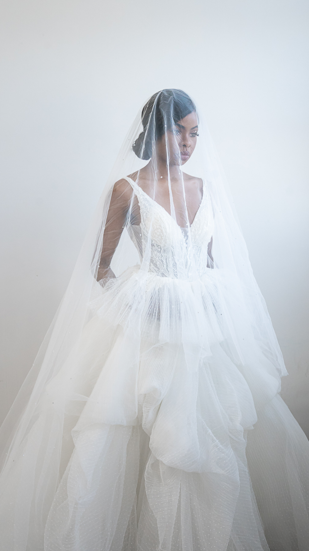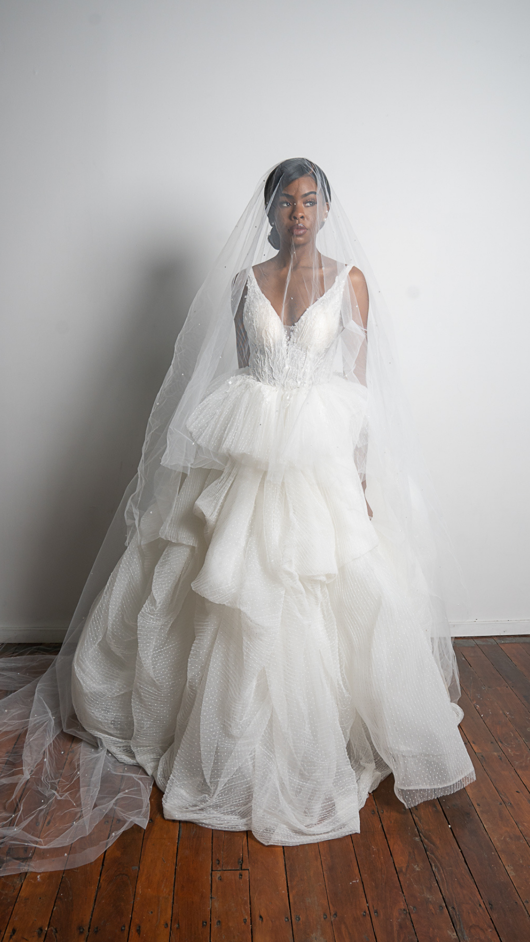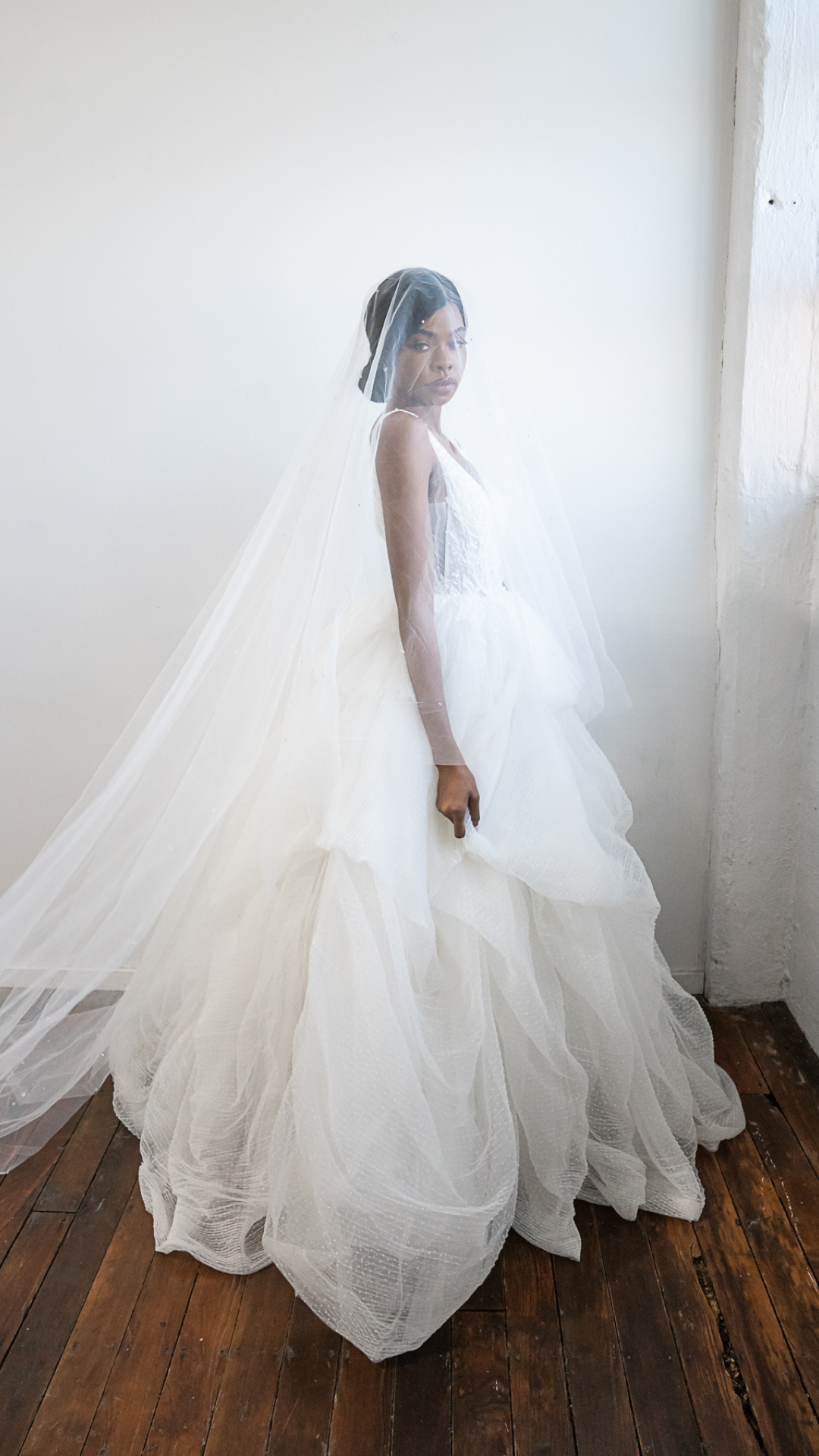 Designed as a modern couture wedding dress with pickups, The Princess Gown features layers of Swiss dot crinkle-pleated tulle, carefully shaped into soft pickups that give the skirt depth and movement while remaining airy and light.